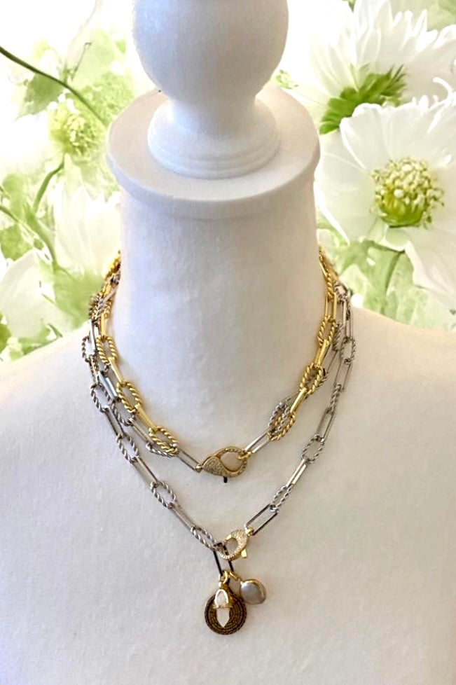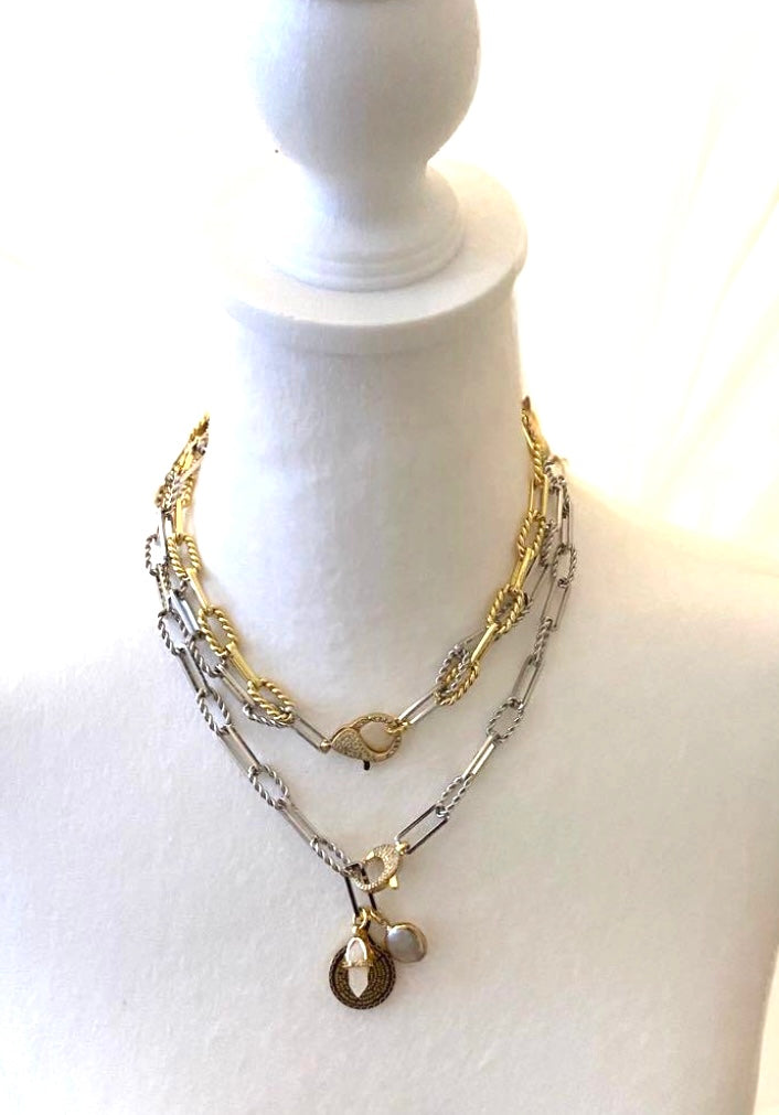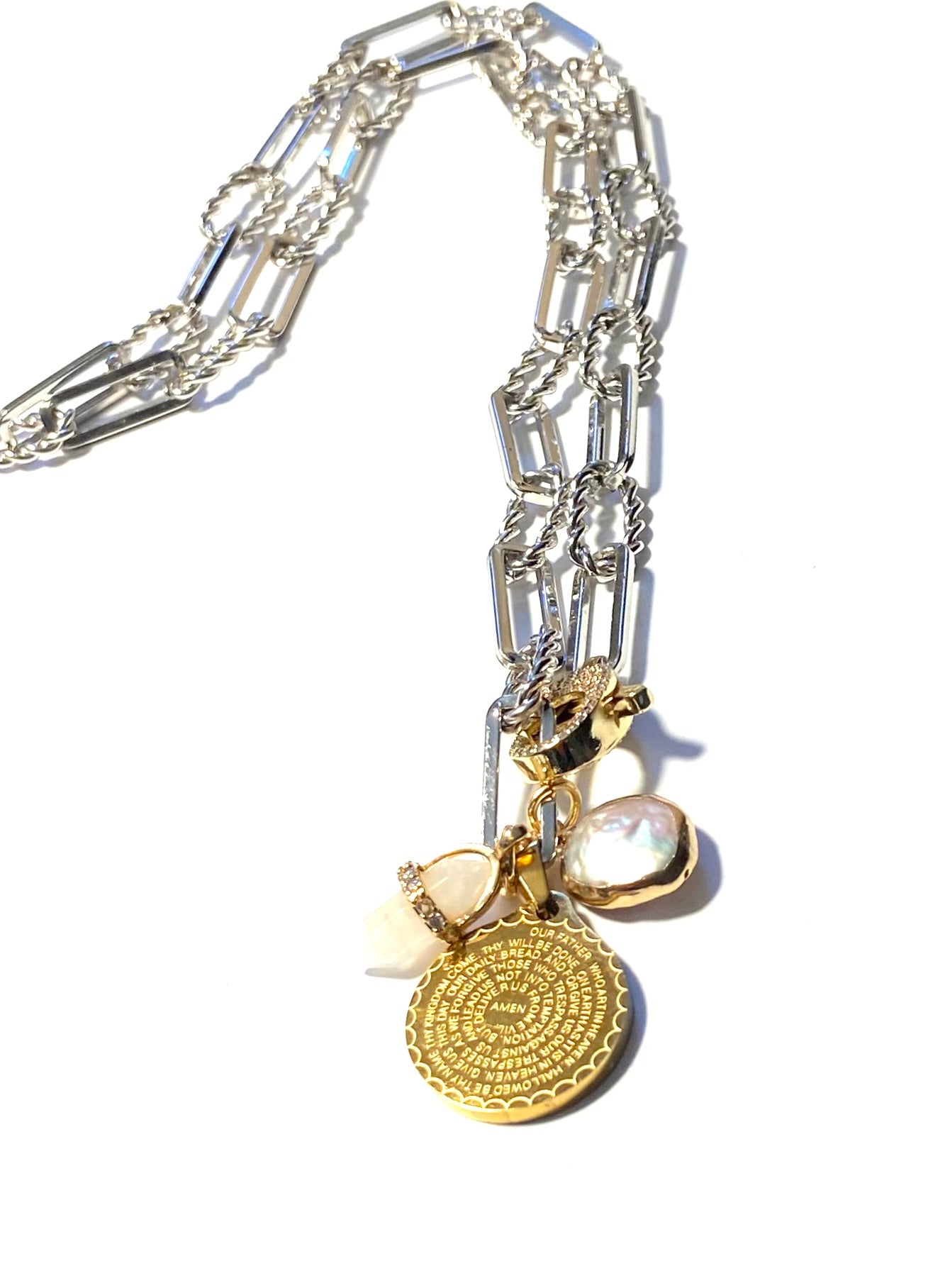 Silver plated paperclip chain with a gold plated fathers prayer medallion, baroque pearl pendant and a moonstone quartz pointed pendant. It has a gold plated rhinestone front clasp.