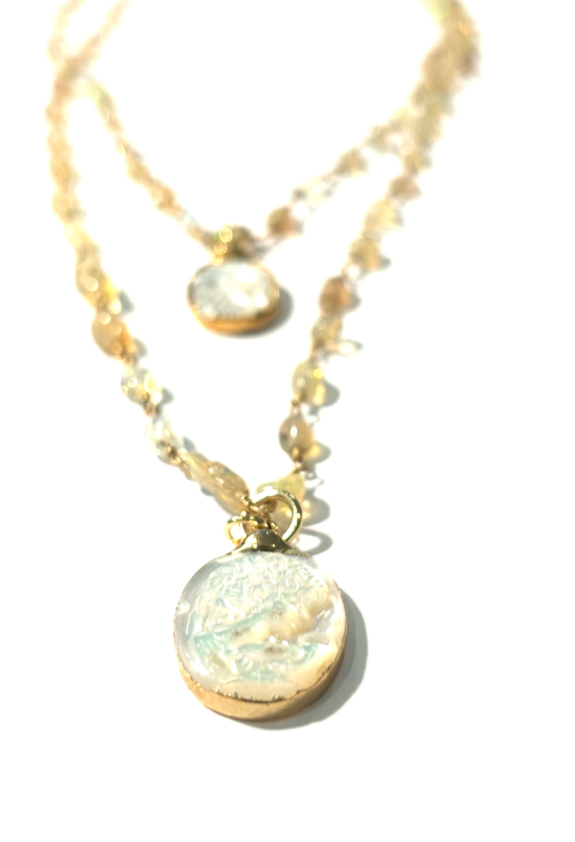 Crafted with refined elegance, this double-strand necklace combines champagne and pearl rosary chain with two delicate cameo pendants for a timeless aesthetic. The paperclip-style clasp ensures secure wear while maintaining the piece's sophisticated silhouette. A versatile addition to any jewelry collection that balances classic charm with contemporary styling.